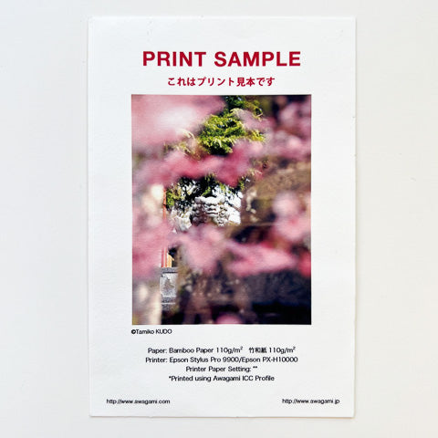 This is a specialty washi (Japanese paper); bamboo fiber treated with a surface coating made exclusively by Awagami Factory, Tokushima, Japan. This coating allows the photographer to reprint with great detail on a soft, matte surface embodied by the soul of bast fibers (low-lignin fibers). Compatible with both dye and pigment inks and tested in and color-profiled for professional models of color Canon and Epson printers. Awagami also notes that both sides may be used for printing on this particular bamboo paper.