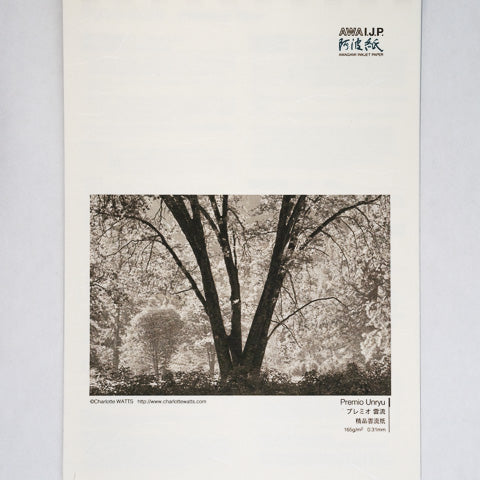 This is a specialty washi (Japanese paper); a two-ply, kozo (mulberry) fiber mix, is treated with a surface coating made exclusively by Awagami Factory, Tokushima, Japan. This coating allows the photographer to reprint with great detail on a soft, matte surface embodied by the soul of bast fibers (low-lignin fibers). Compatible with both dye and pigment inks and tested in and color-profiled for professional models of color Canon and Epson printers.