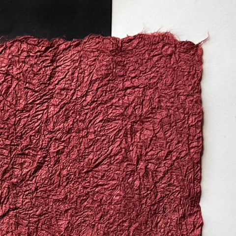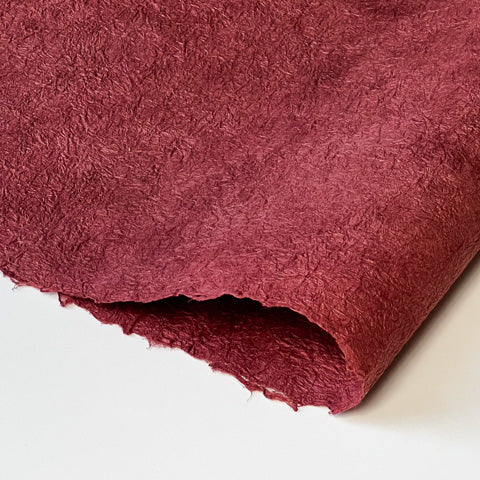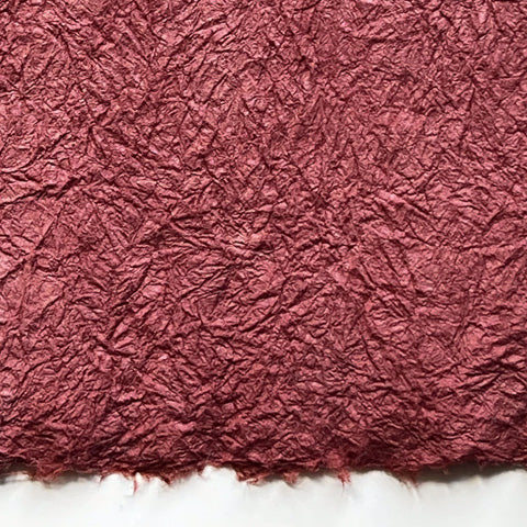 This vintage, vat-dyed kozo sheet has been treated with konnyaku (devil's root) starch making it literally "strengthened" and it is hand-crinkled. After several rounds of boiling the paper with konnyaku starch (applied like a clear paint),and drying on the line in between, the sheet becomes a fabric used in the old days for many household goods as well as clothing.