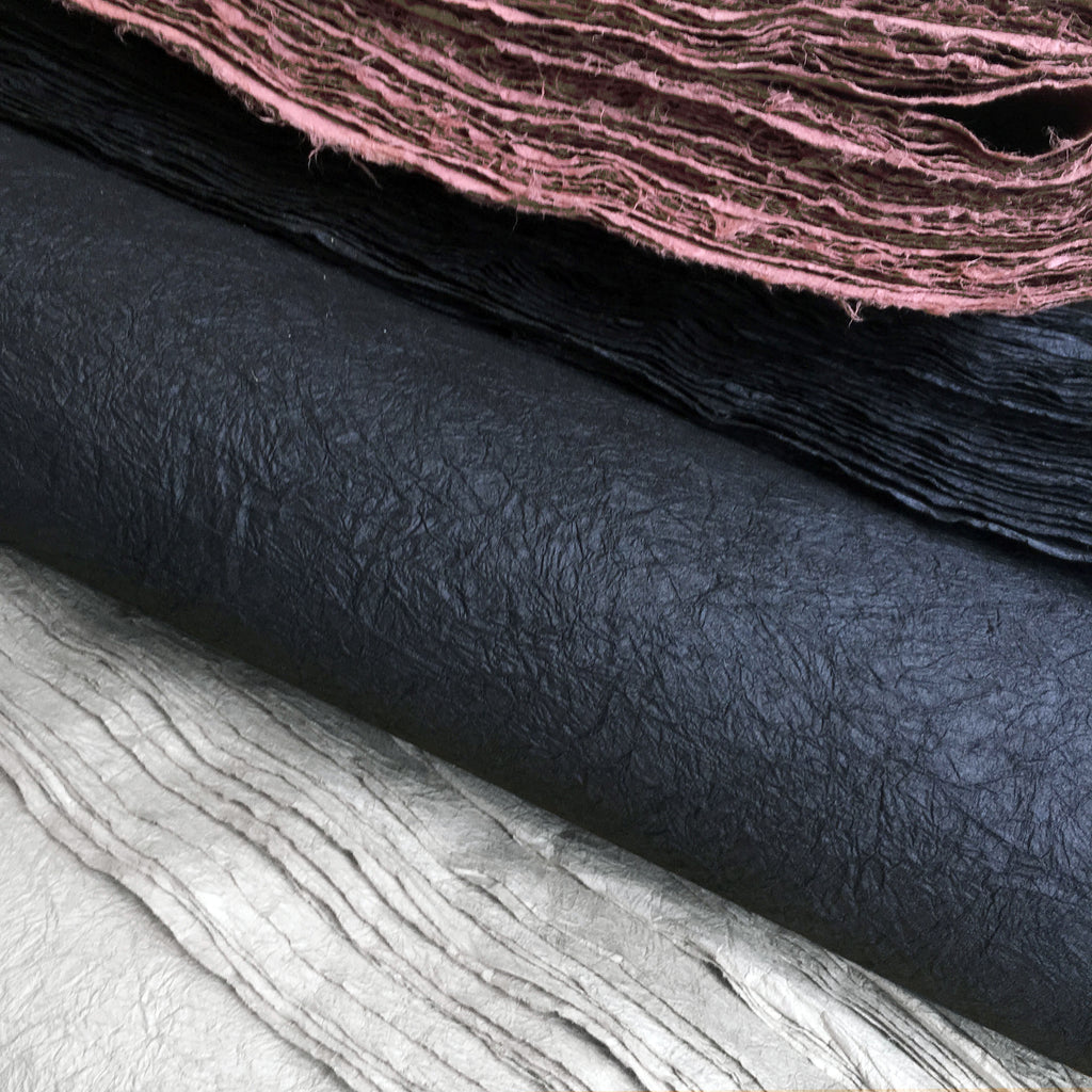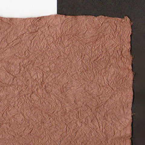 This vat-dyed kozo sheet has been treated with konnyaku (devil's root) starch making it literally "strengthened" and it is hand-crinkled. After several rounds of boiling the paper with konnyaku starch (applied like a clear paint),and drying on the line in between, the sheet becomes a fabric used in the old days for many household goods as well as clothing.